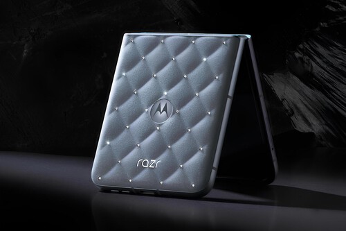 El motorola razr de The Brilliant Collection mantiene su icónica silueta plegable, pero añade elementos de alta orfebrería: 35 cristales Swarovski colocados a mano, incluyendo uno principal con 26 facetas en la bisagra.