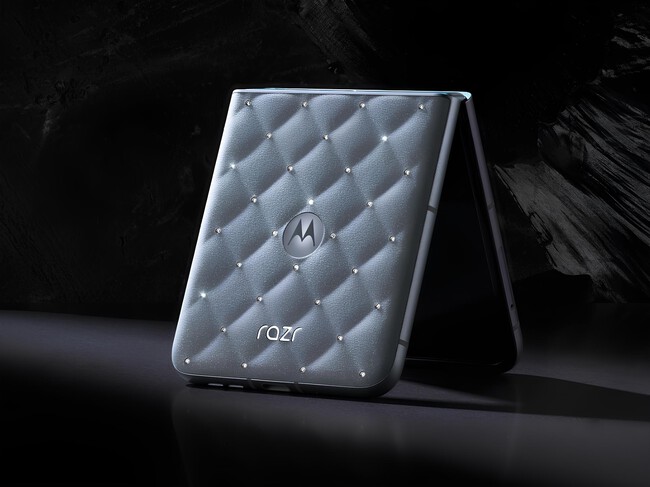 El motorola razr de The Brilliant Collection mantiene su icónica silueta plegable, pero añade elementos de alta orfebrería: 35 cristales Swarovski colocados a mano, incluyendo uno principal con 26 facetas en la bisagra.